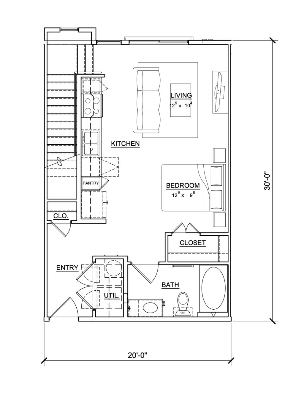 - Bed / 1 Bath / 600 sq. ft.
